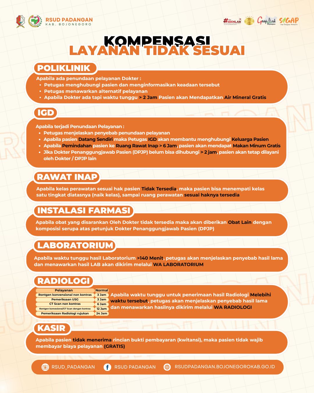 Jika anda menerima layanan kami dan mengalami kendala dari waktu seharusnya, anda berhak menerima Kompensasi yang sudah disiapkan untuk pasien