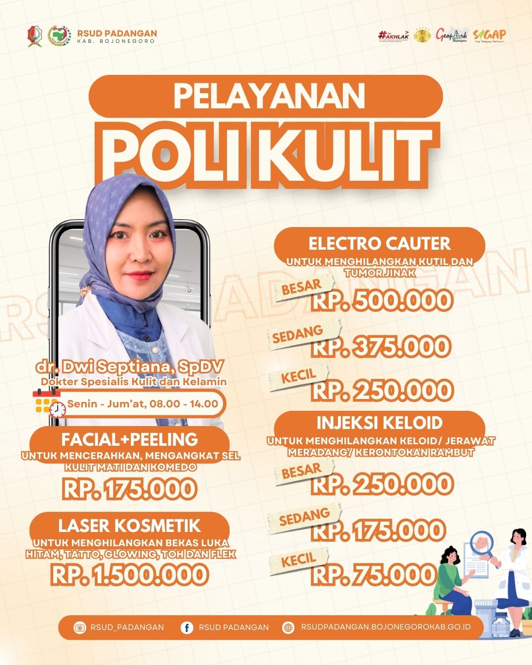 Jaga kesehatan kulit Anda bersama kami. Kulit sehat, percaya diri meningkat. Poli Kulit & Kelamin RSUD Padangan hadir untuk membantu Anda mengatasi berbagai masalah kulit maupun kesehatan kelamin dengan layanan ramah dan profesional. Yuk, jangan tunggu parah baru periksa. Lebih cepat ditangani, lebih baik hasilnya.