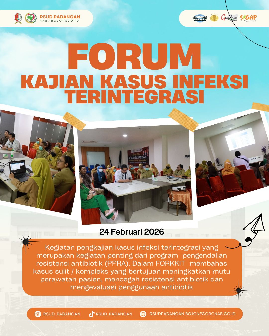 Kegiatan Forum Kajian Kasus Infeksi Terintegrasi (FORKKIT) adalah kegiatan penting dari program pengendalian resistensi antibiotik (PPRA). FORKKIT membahas kasus yang sulit / kompleks dengan tujuan meningkatkan mutu perawatan pasien, mencegah resistensi antibiotik dan mengevaluasi penggunaan antibiotik. Kegiatan ini dihadiri oleh Dokter Spesialis Dalam (dr.Rizko), Dokter Spesialis Paru (dr.Gema), Dokter Spesialis THT (dr.Netiana), Dokter Spesialis Obgyn (dr.Indah) serta perwakilan DPJP Spesialis lain, Dokter umum dan Tenaga Medis lainnya yg ikut serta dalam FORKKIT. Semoga dengan kegiatan berikut ini kita semua lebih meningkat lagi dalam memberikan pelayanan yg terbaik kepada Masyarakat. RSUD Padangan Siap Memberikan Pelayanan yang terbaik.